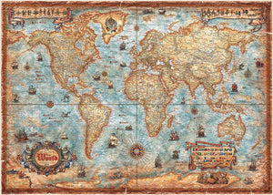 This world map, elaborately designed in the antique style, shows the countries of our earth as they are geographically and politically represented today. With lots of additional details! 2,000 piece jigsaw puzzle.