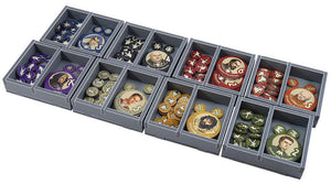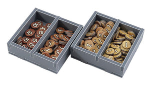 • Each of the player factions has their own tray with separate slots for the token types. The spice tokens are sorted by denomination and give easy access to the players. All card trays have space for sleeved cards.