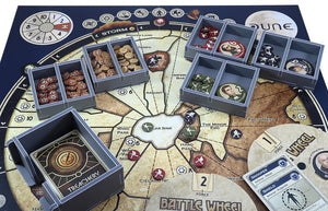 Insert compatible with Dune and the Ixians and Tleilaxu expansion. The design provides both efficient storage and improved game play. Many of the trays can be utilised during the game, and they greatly aid set-up and clear-away times. The rules and boards act as a lid on top of the trays. The design works with both the standard retail version, and with the limited edition which includes miniatures.