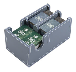 The design provides both efficient storage and improved game play. The trays can be utilised during the game, and they greatly aid set-up and clear-away times. The rules and boards act as a lid on top of the trays.
