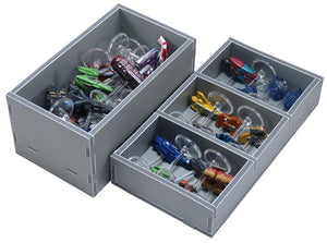 Insert compatible with Xia: Legends of a Drift System®, including the Embers of a Forsaken Star®, Sellsword®, and Missions and Powers® expansions. The design provides both efficient storage and improved game play. The trays can be utilised during the game, and they greatly aid set-up and clear-away times. The rules and boards act as a lid on top of the trays.