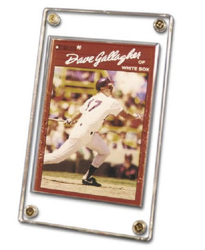 Exterior Dimensions: 3 x 4 7/8 x 1/4 Interior Dimensions: 2 1/2 x 3 1/2 x 30pts The Pro-Mold 4-Screw Holder Is designed to attractively display one card. Unlike other 4 screw screw downs, this one has a recessed area on the lid above the card that gives the card a three dimensional look. This holder has inter-locking screw holes that make it stackable.
