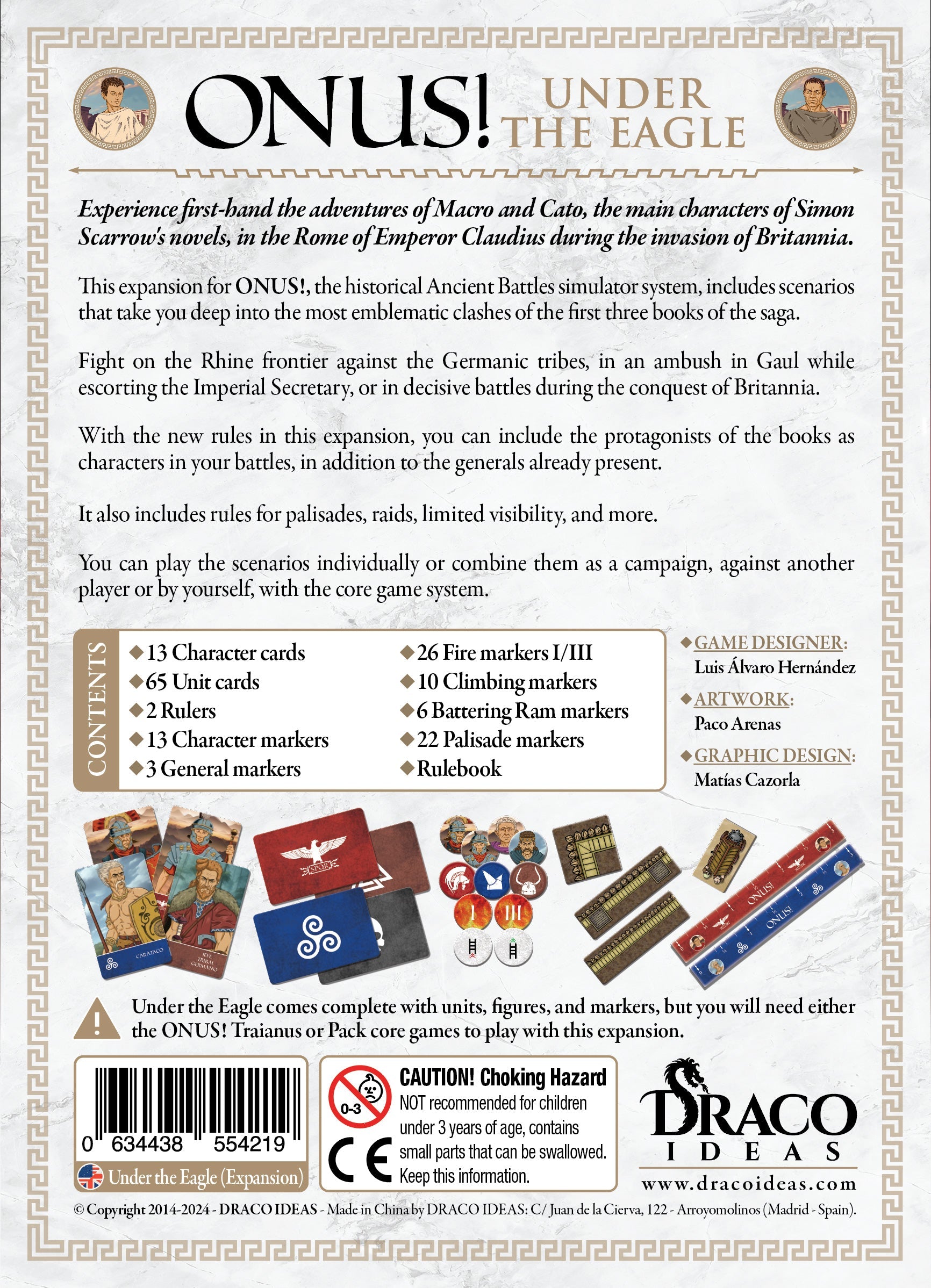 Simon Scarrow's Eagle series of books takes us back to the times when Claudius was emperor in Rome, beginning with the invasion of Britain, through the adventures of his characters Macro and Cato. The Eagle expansion incorporates new rules for the use of characters (in addition to generals), palisades, assaults, limited visibility and much more. It includes scenarios of the main confrontations of the first three books, starting on the border of the Rhine River against a tribe of Germanic tribesmen, suffering an ambush in Gaul escorting the imperial secretary or decisive battles in the conquest of Britain. Eagle includes units, characters and markers, although you need one of the base games, ONUS! Traianus or ONUS! Pack, to play with this expansion.