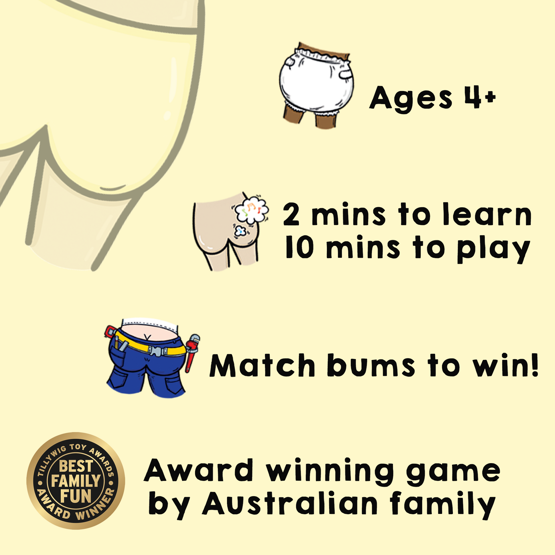Not only did parents and grandparents find Go Bum to be good clean family fun for even the youngest players, they deeply appreciated the ways in which the quirky, charming bum depictions enlivened game play from the get-go.