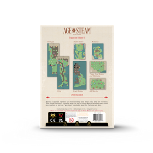 Age of Steam Deluxe: Map Expansion Volume II will consist of seven new expansion maps that have never previously been released in the Deluxe style: Portugal, Italy, Scotland, Seattle Metro, Great Britain, Texas/Oklahoma/New Mexico, and 1890 Berlin. The Italy map will come with 7 new Track tiles, and the Texas/Oklahoma/New Mexico map comes with 32 Cattle Cubes, which are wooden cubes spotted like cows.