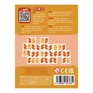 In Autumn each player takes turns placing a card on other previously played cards. Each card shows four groups of leaves and, in order to play it, you should place it overlapping other cards in play, covering one or two groups. The goal is being the player with the largest area of connected leaves at the end of the game.