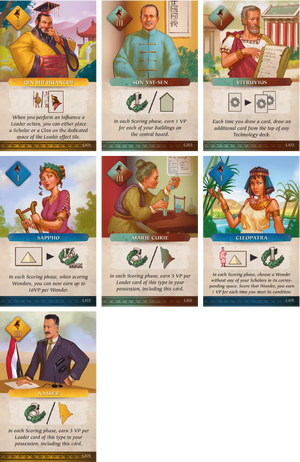 Each epoch spans a preparation phase, an action phase, and a scoring phase. Other players have accepted the same charge you have and will be grappling with life through the action phase simultaneously with you in real time. Your two 30-second sand timers will trigger your actions expanding your territory, building wonders, and discovering new technologies while a soundtrack keeps the tempo of history. You probably won't be able to look everywhere at the same time, so try to ensure that you don't overlook a potential attack because you're too busy helping to complete a wonder!