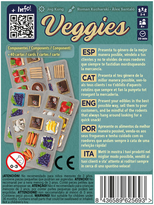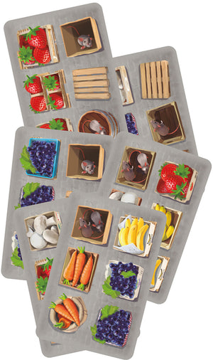In Veggies, a.k.a. Magazynier, 2-4 players compete to build the most successful produce stand in the market from eight cards that they'll place turn by turn. Each card contains six spots in a 2x3 layout, with those spots containing strawberries, bananas, grapes, carrots, mushrooms, an empty pallet, or rats. On a turn, play the card in your hand or a card of your choice from the row of three cards into your layout. You can overlap the cards as you wish, so long as you retain a grid structure of how they're laid out. If you played from your hand, you draft a face-up card to end your turn, then reveal a new card.