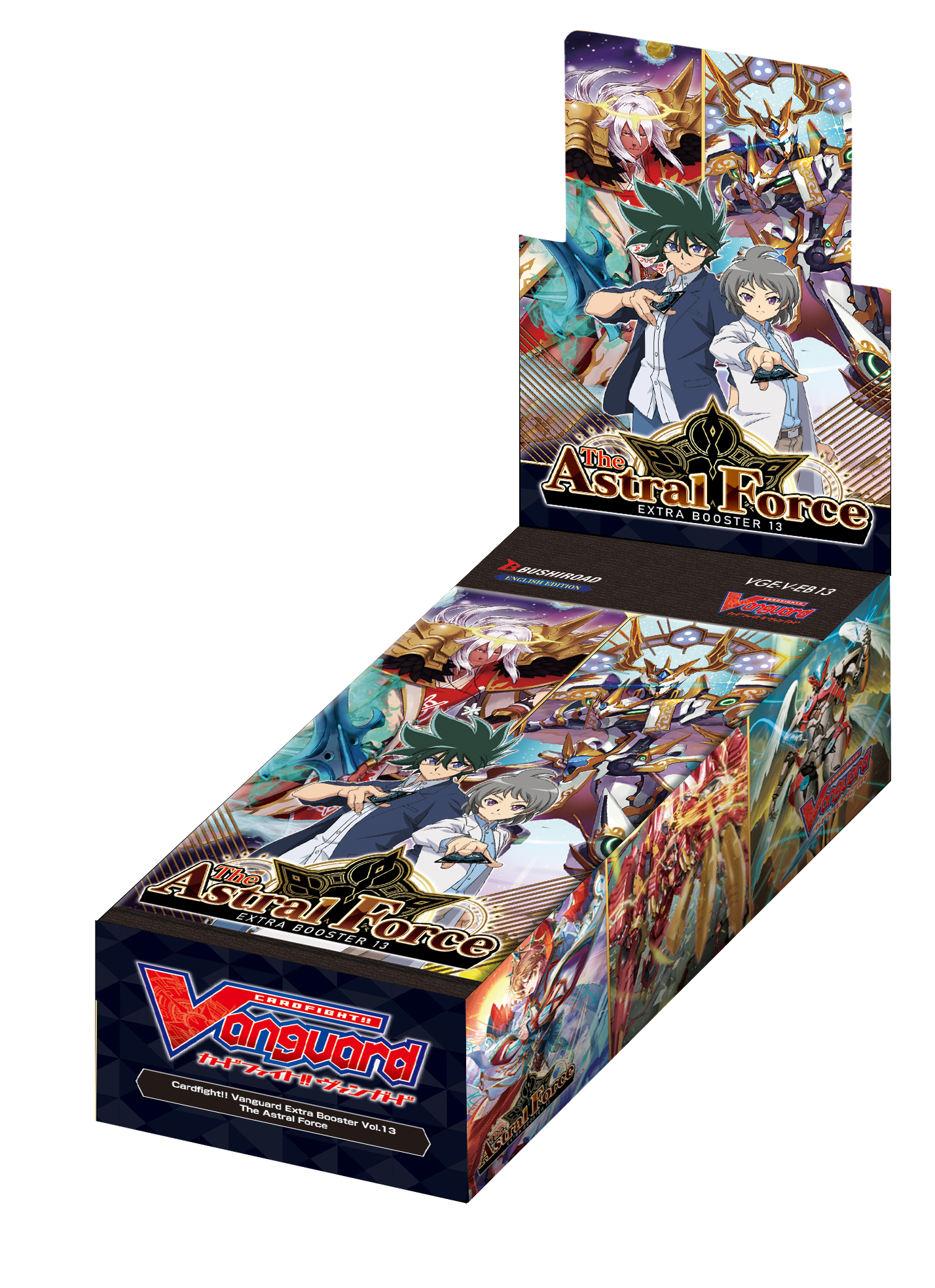 The Cardfight Vanguard: Astral Force set features cards used by Shinemon Nitta, Tatsuya Tachibana, and Ryuzu Myoujin in the new series! The set strengthens the decks that make use of the new "Astral Plane" ability. The Angel Feather that Tatsuya Tachibana uses utilizes the damage you have taken to unleash powerful effects, improving their use of the damage zone! The Astral Force set also features cards that revolve around the use of Imaginary Gift: Protect II! For Gear Chronicle, there is a new gimmick that powers up by using more cards from your hand, paving the way for a more aggressive playstyle! The trump card of Ryuzu Myoujin - Chronofang Tiger - is included. 62-card set (54 new/8 reissues) - 3 VR, 6 RRR, 9 RR, 15 R, & 29 C, + parallels (including SVR & SP). 12 packs/box. 7 cards/pack (2 are R or better).