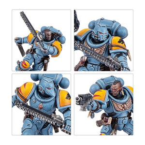 The kit includes parts to build an optional Pack Leader who can be armed with a chainsword, power sword, power axe, or lightning claw in one hand, while the other hand can be empty or carry a plasma pistol or bolt pistol. They have a choice of three heads – one helmeted and two bare – two backpack icons, and three shoulder pads – one featuring the sigil for Ragnar Blackmane's Great Company, one for Logan Grimnar's, and a blank one. The kit includes 24 heads and 22 shoulder pads, which are interchangeable across the rest of the squad, as are the weapons. There are also 14 combat knife sheaths, 16 pistol holsters, and four wolf tooth necklaces to further customise your impetuous warriors.
