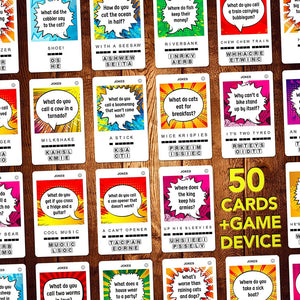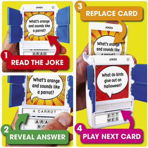 POCKET - SIZED AND PACKED WITH FUN. Check out the anagram and open the four doors to unveil the colourful question card. Make a guess and then slide to reveal the witty punchline.