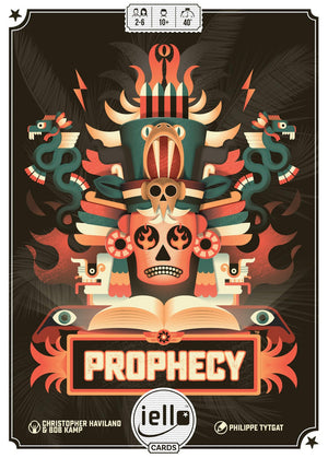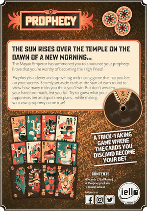The Sun rises over the Temple on the dawn of a new morning… The Mayan Emperor has summoned you to announce your prophecy. Prove that you’re worthy of becoming the High Priest! Prophecy is a clever and captivating trick-taking game that has you bet on your success. Secretly set aside cards at the start of each round to show how many tricks you think you’ll win. But don’t weaken your hand too much, lest you fail. Try to guess what your opponents bet and spoil their plans. while making your own prophecy come true. Be sure to keep your third eye on your opponents. Suitable for 2 to 6 players aged 10 and up with a playing time of 30 to 40 minutes.