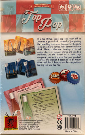 As owner of a soda pop company, you need to make sure your that your product captures the market it deserves in all of the major cities and that it knocks out the competition leaving just one Top Pop. Top Pop is a card game where players are placing city cards onto the table and stacking bottle caps (which represent the companys influence) onto the played cities on the table. At the start of the players turn, if their bottle cap is on a higher stack than the other players on a city card, that player collects that city. If not, they continue to try to gain dominance on city cards where they can.