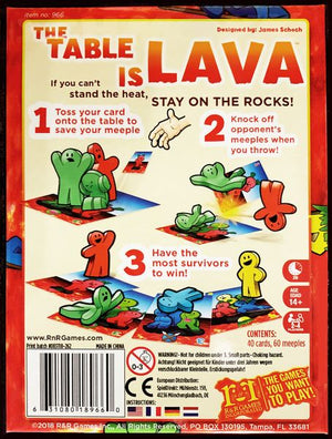 The Table Is Lava presents players with a simple challenge: Toss cards onto the table to save your meeples, while trying to knock other players' pieces into the lava at the same time. Have the most survivors, and you win!