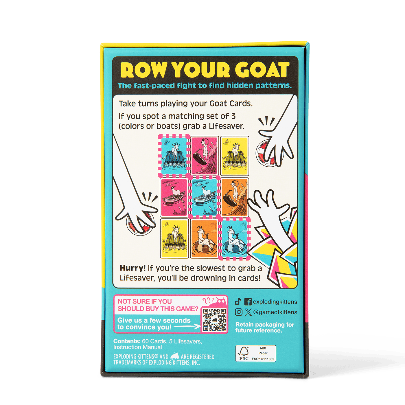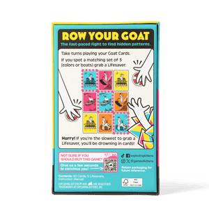 Row Your Goat is a rapid-fire picture-matching, fast slapping game. Get rid of your cards by placing them in a grid. The second you see a matching set of 3 in a row, slap the nearest Lifesaver. Hurry, there's only a few of them. And if you don't grab one fast enough, you're left collecting cards. When you're down to one card, scream “ROW MY GOAT”, play your card, and slap a Lifesaver to win.