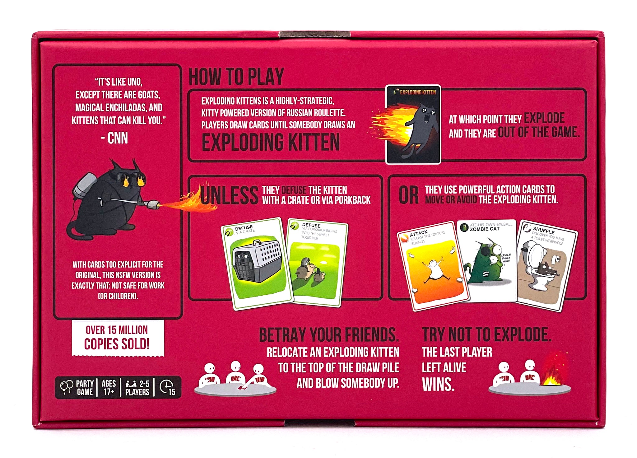 This NSFW Edition of Exploding Kittens is an ADULT ONLY party game for 2-5 players (up to 9 players when combined with any other deck).