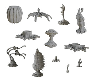This Alien Jungle Terrain set provides 15 pieces of detailed and ready-to-paint PVC flora to adorn your Firefight or Deadzone battlefields and provide tactical cover for your troops. This set of modular trees have an alien jungle theme, but can easily be combined with other sets to create a visually stunning battlefield, for fantasy and sci-fi gaming alike. Modular parts have 5mm holes for magnets (not supplied), for gamers that wish to recombine their trees for each game!