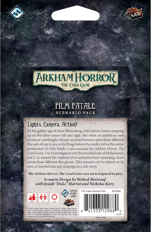 Welcome to Film Fatale , the latest scenario pack for Arkham Horror: The Card Game ! In this spectacular scenario, one of four investigators takes on their roles on Hollywood's Lot C, where three troubled film sets play host to bizarre and dangerous events. As space and time warp and fiction becomes reality, you'll negotiate with alien Saturnites, flee hungry dinosaurs, and fend off bloodthirsty vampires as you attempt to solve this riveting mystery.