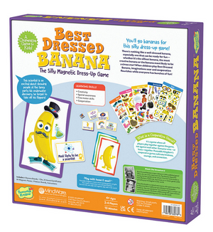 Players will go bananas for this silly magnetic dress-up game! Take turns dressing the bananas and then awarding each banana with a certificate. Choose from silliest banana, most creative, most likely to be a scientist and more in this cooperative game where everyone wins! A cooperative game that encourages players to work together. Players dress up their bananas in the most silly or creative way. Develops creativity, spatial awareness, fine motor skills and cooperation. Ideal for 2-4 Players Ages 4 and Up. Includes 4 banana boards, 1 die, 20 award certificates, 84 magnetic pieces, 5 feature boards and instructions.