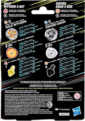 • INTERCHANGEABLE DIE-CAST BLADES: Includes Takara Tomy-designed Beyblade X top with authentic die-cast metal parts: Gale Wyvern 3-60T Right-Spin Balance Type top with Stamina Type Blade and Sword Dran 3-80B Right-Spin Stamina Type top with Attack Type Blade