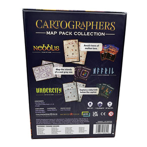 Cartographers: Map Pack Collection includes three new maps featuring thematic twists and gameplay additions to expand your game of Cartographers or Cartographers Heroes. The three maps (1: Nebblis, 2: Affril, and 3: Undercity) were previously sold separately in their own packaging but are now combined into a single boxed collection.