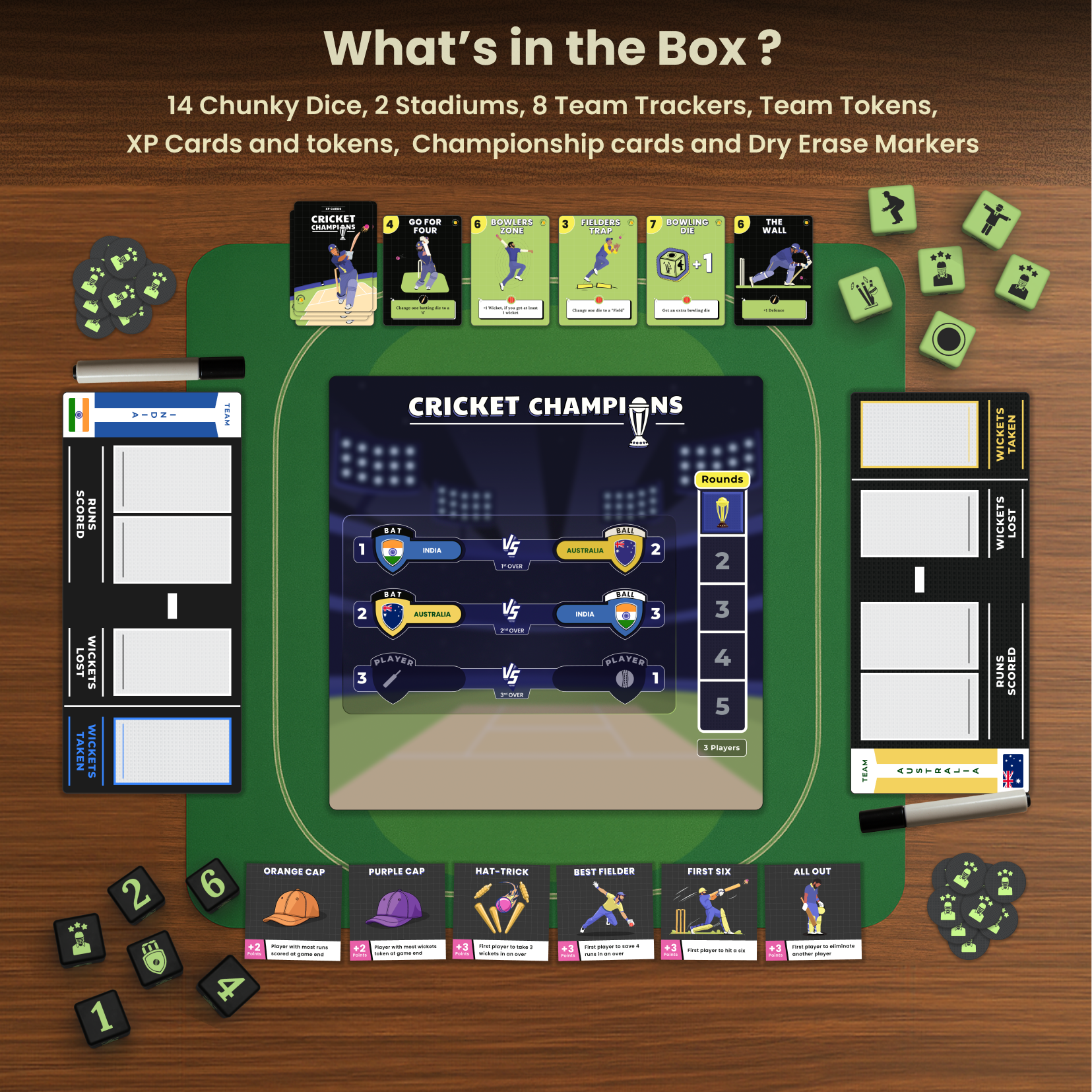 Cricket Champions turns your love for cricket into a thrilling board game. After picking your team, you’ll take turns batting and bowling by using 6 chunky dice. Batsmen aim to build the highest score using singles, boundaries, and clever Xp cards, while bowlers try to outwit them with wickets, and their own enhancements. Each inning is fast-paced and filled with surprises—just like real cricket! It’s a mix of skill, luck, and good old cricket instinct.
