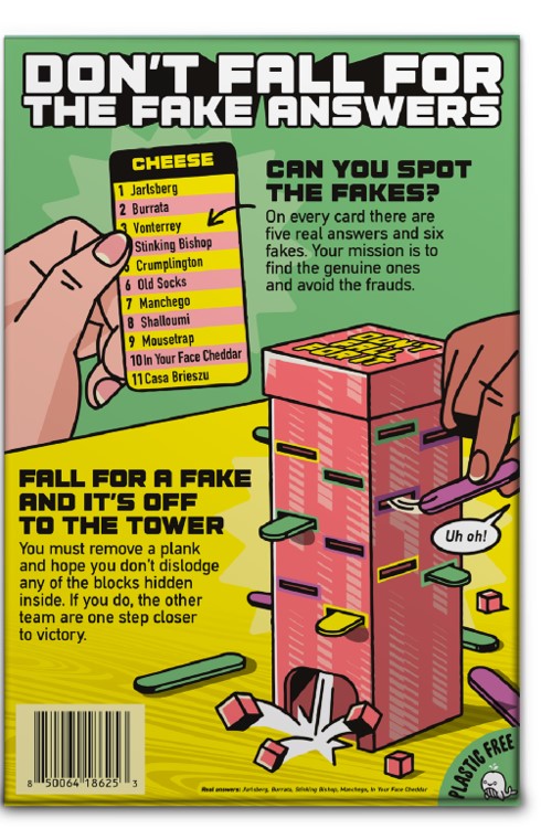 On every card there are five real answers and six fakes. Your team’s risky mission is to find the genuine answers and avoid the frauds. Pick a fake and you’re sent to the tower!
