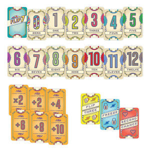 Sound easy? Think again! This isn't just any deck of cards¦ In Flip 7, there's only one 1 card, two 2's, three 3's, etc. plus a bunch of special cards that can score you extra points, give you a second chance, or freeze you or your opponents in your tracks. Are you the type of player to play it safe and bank points before you bust, or are you going to risk it all and go for the bonus points by flipping over seven in a row? Press your luck meets strategy in this addictive card game that's sure to be the greatest card game you've ever played!