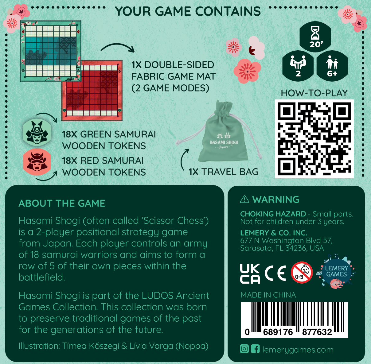 Hasami shogi is a traditional Japanese game played on a shogi-ban, i.e., a 9×9 grid of spaces, using the fhuyo (pawns) from a shogi set (and as such this game should not be considered a Shogi Variant as the capture rules differ greatly. The pieces initially occupy the entire back row, i.e., the row of spaces nearest the controlling player. As in shogi, the sides are called sente (black) and gote (white) with sente going first, but the colors associated with the names are purely conventional. The object of the game is to be the first player to capture either five or eight of an opponent's pieces, as agreed upon before starting the game. An opponent's piece is taken by custodial capture, i.e., by being sandwiched horizontally or vertically (but not diagonally) between a player's own pieces. A piece must be moved into such a postion immediately on either side of an opponent's piece to make a capture, but multiple captures can be made simultaneously. This occurs only if a piece is moved so that it causes more than one enemy piece to be positioned between the piece moved and another of the player's own pieces.