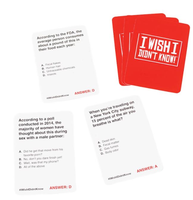 I WISH I DIDN’T KNOW: Compete with your friends and family by guessing which gross fact is actually true. Just read off the answer choices and hear your audience groan! By the end, you’ll all be experts on all things you wish you didn’t know.