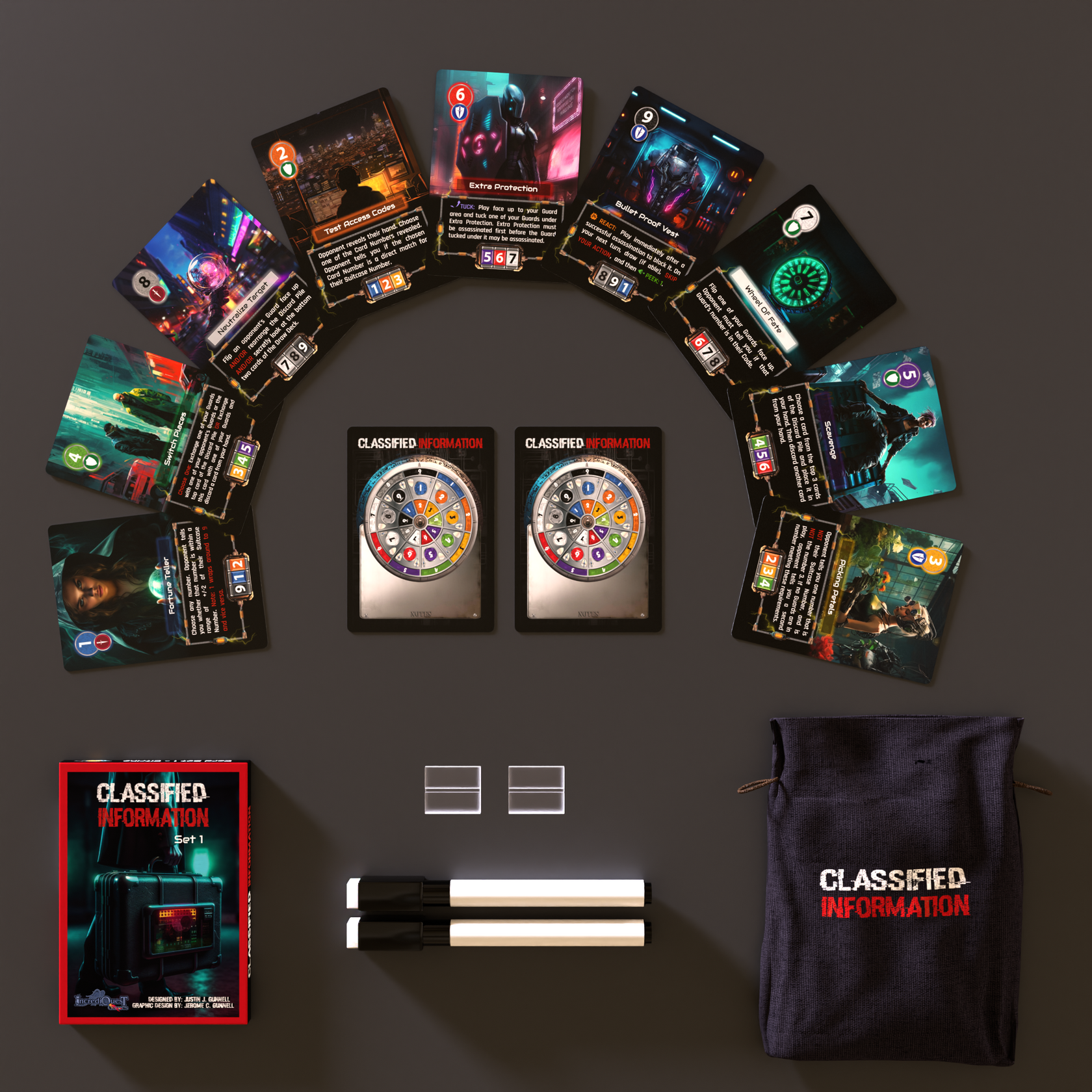 In the quest for political supremacy, knowledge is key. Since the revolution, two factions have been fighting for power in the dystopian cyberpunk city of Intellexia. To break the years-long stalemate and secure control of the city, each faction must uncover their adversary's secret plans, hidden in their top-secret, code-protected briefcase. Your task, should you accept it, is to protect your secret code by cunningly deploying card abilities, enlisting the help of Guards, Assassins, and Sentinels from local techno-noir guilds, and encrypting information where possible. But espionage is a two-way street. While trying to deny your opponent information about your secret code, you must try to crack theirs. Will you be able to access your opponent's Classified Information?