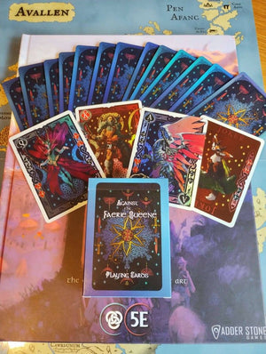 This is a full set of 52 traditional playing cards and 2 jokers that can be used for general gaming as well as for play in Legends of Avallen and as Fate Cards in 5th Edition for Against the Faerie Queene encounters.