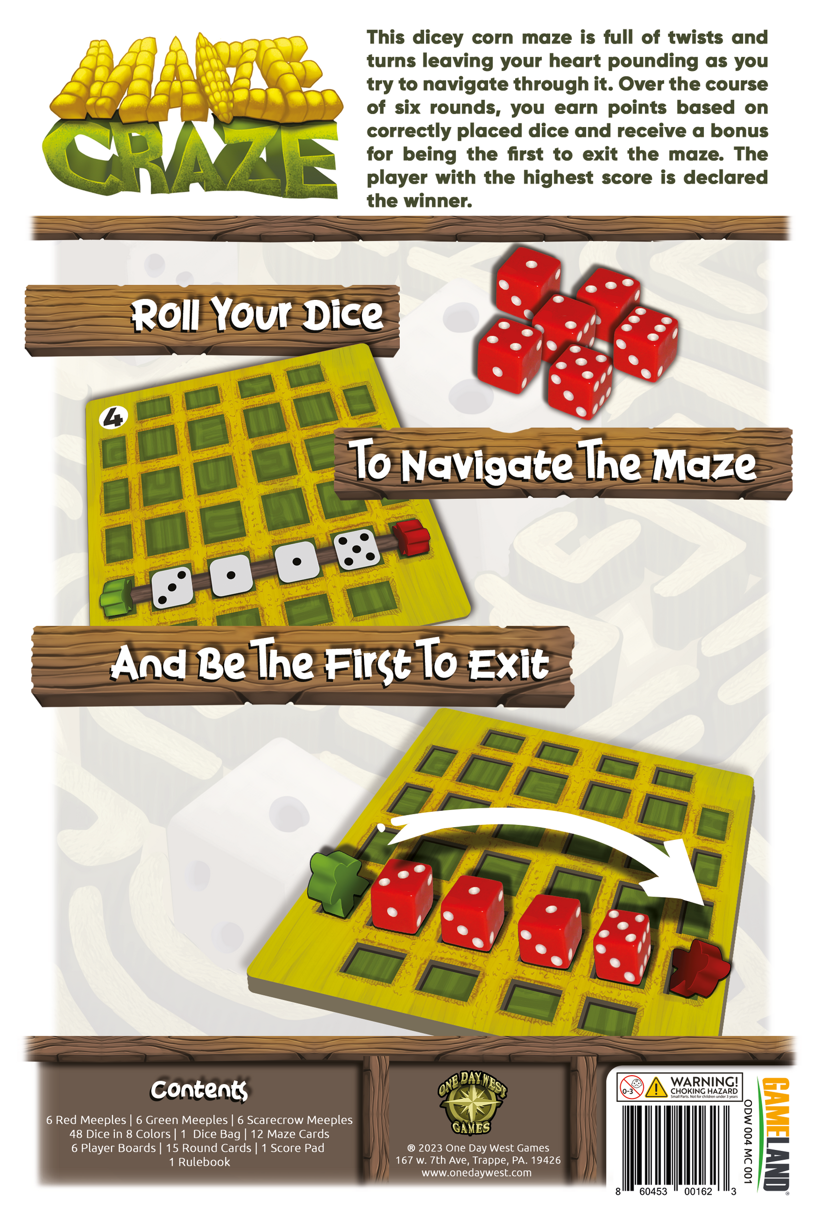 In Maize Craze, 2-6 players will simultaneously roll and place dice on their player boards attempting to match various paths shown on a maze card in the center of the table. You earn points based on correctly placed dice and receive a bonus for being the first to exit the maze. The player with the highest score after 6 rounds is declared the winner. The game features 12 double sided maze cards to give 24 different maze configurations with varying difficulty. There are also 15 unique "round" cards which alter the way the game is played over the course of the 6 round cards. Both combine to give great replayability to the game.