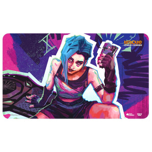 Forge your path through the Rift with this Jinx playmat that provides protection, style, and serious presence at the table. Stitched trim playmat in a retail-ready box allows players to protect their cards in style!