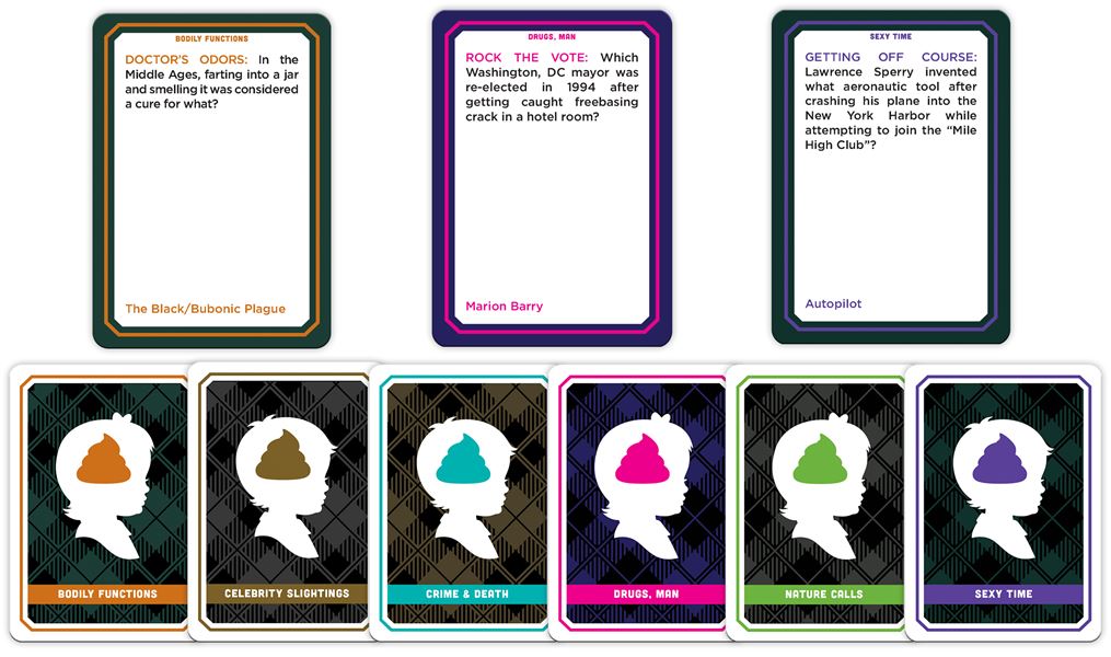 Shit For Brains was born out of a love for bar trivia and a hate for boring facts. Frustrated with questions about Presidents (but not about naked Presidents), and rivers (but not about rivers catching on fire), and animals (but not about weirdly-shaped animal penises), we decided to make a game for people like us. It's a game full of hilarious, morbid, irreverent, outrageous, disgusting, ironic, awesome, pathetic, twisted, and downright weird trivia. Each SFB box comes with 600 cards (6 categories with 100 cards each), a die, and a whole lot of love and bad jokes.