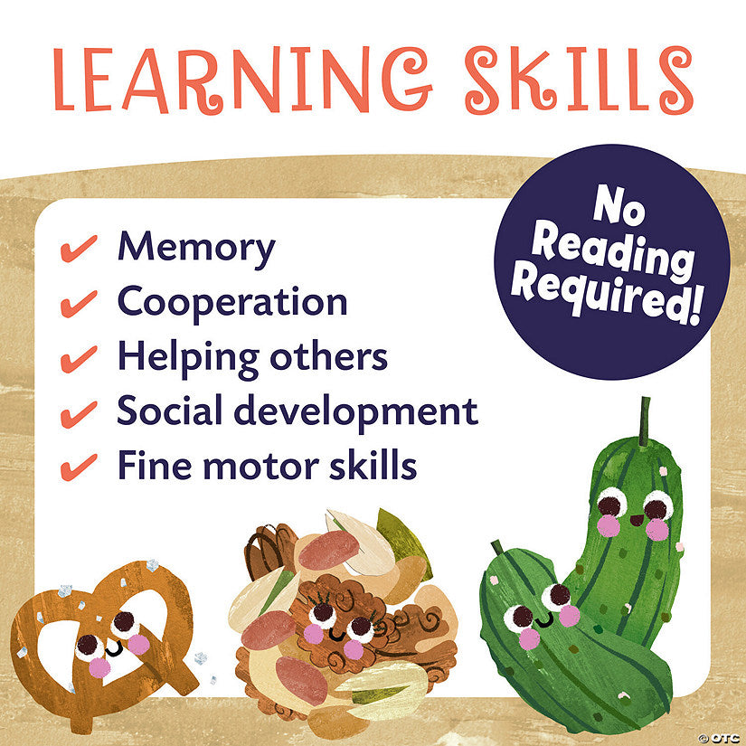This memory game has a deliciously collaborative spin! Join forces with other players, turning over food wedges to match pairs of tasty foods and fill the snack board with matching treats. But look out for the stinky cheese, sure to sour everyone's appetites! If you match the 13 snack ingredients before turning over all 10 stinky cheese wedges, everyone wins. The one fancy cheese wedge can help save the day! With a quick, 15-minute playtime and no reading required, this cooperative game is a recipe for preschoolers and kindergarteners to have fun while learning crucial skills. Serve up extra challenges: use the included tongs to flip over pieces, and try matching ingredients to the 10 included charcuterie board recipes. For 2-6 players.
